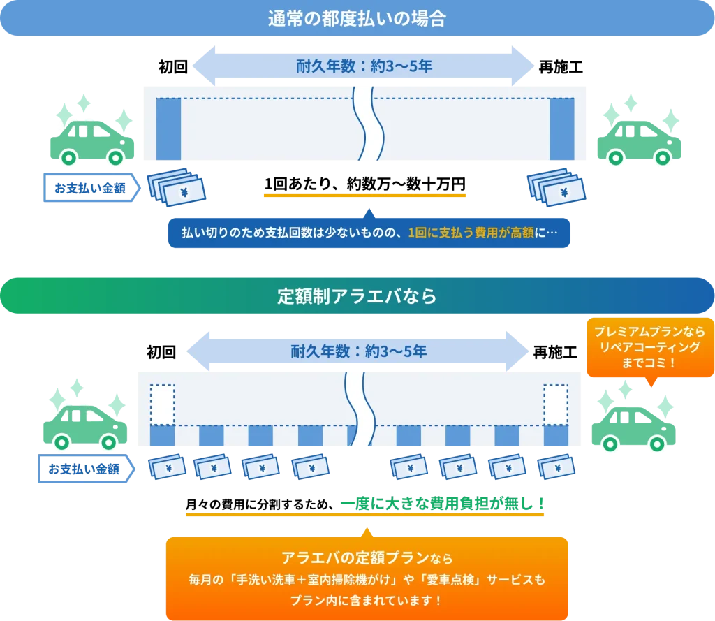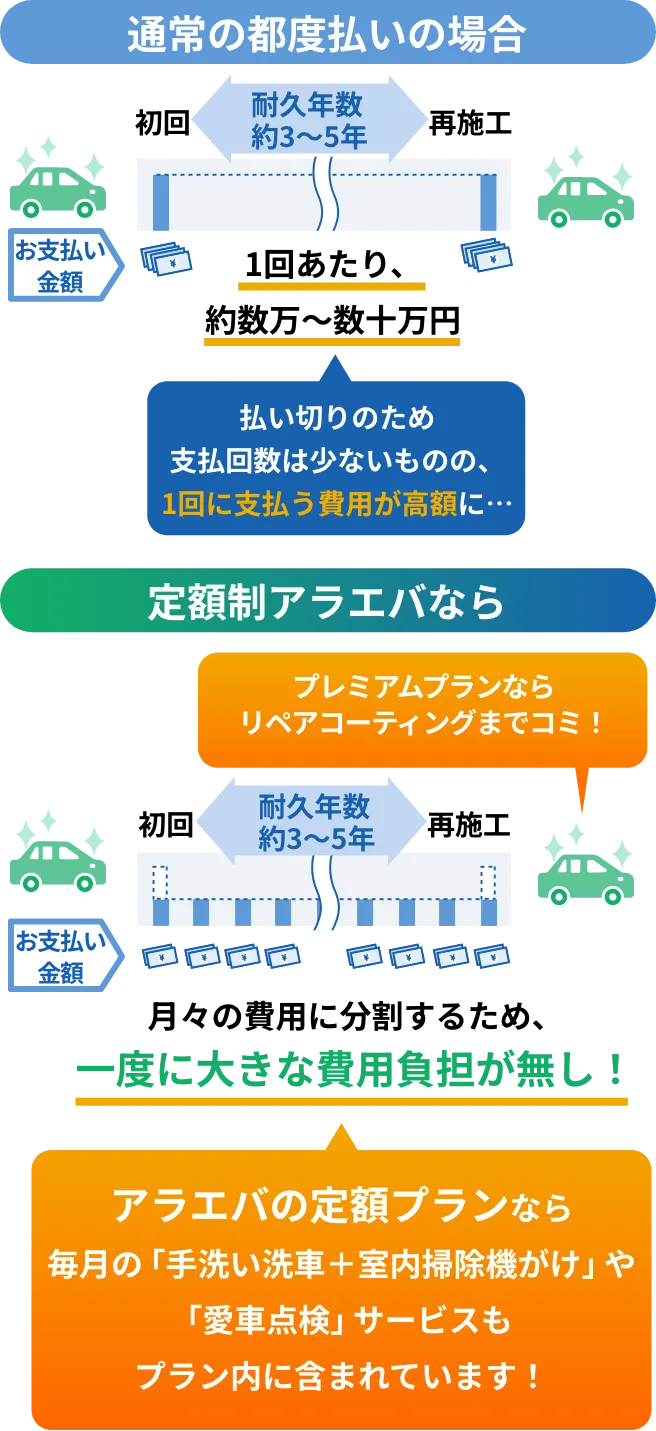 カーコーティングといえば、従来は施工時に一括でお支払いいただいていました。その金額は数万円〜と高額。ですがアラエバなら、月々お支払いのサブスクなので、一度に大きな負担をしていただくことなく、手軽におクルマのキレイを実感いただけます。