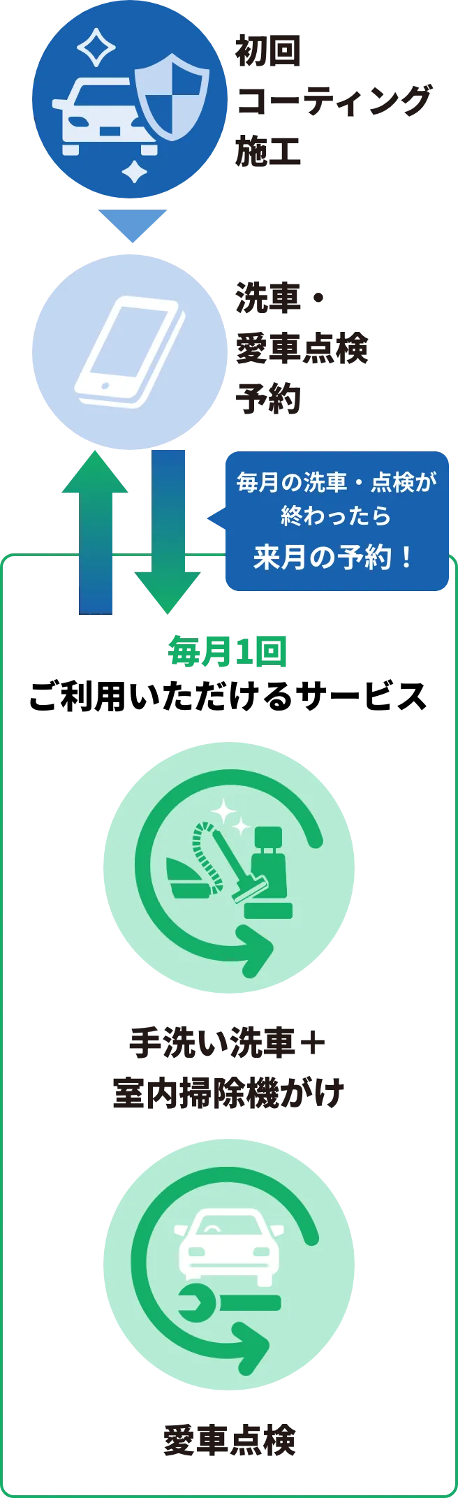 初回コーティング施工後、毎月「手洗い洗車+室内掃除機がけ」と「愛車点検」のサービスをご利用いただけます。いずれも「アラエバ定額プラン」内に含まれるサービスなので、ぜひお気軽にご利用ください!